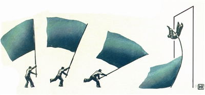 挥舞大旗,循序渐进,把握契机,撑杆而跃。看似寻常的连贯动作,“跳”出了人们的习惯思路,这正是漫画的逆向思维。