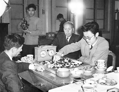 图为陈祖德(右一)和日本九段棋手杉内雅男比赛时的情形。比赛共进行了九个多小时,陈祖德胜对方半个子。(摄于1963年) 新华社发