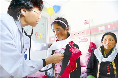 11月5日,先心病患儿索朗群宗(中)在安徽省立儿童医院接受身体检查。