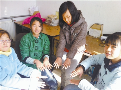 煤少,温度低,刘颖、杨萍等学生的手每年都生冻疮。“发痒时,就刮窗上的冰霜涂在手上,这是偏方。”王艳勤传授止痒“经验”。她右手中指明显比其他的粗,红肿中有结痂,这已从冻疮衍生了风湿关节炎。