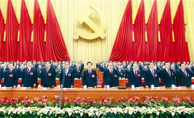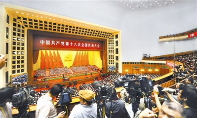 人民大会堂雄伟庄严,万人大礼堂气氛热烈。主席台上方悬挂着“中国共产党第十八次全国代表大会”的会标,后幕正中是镰刀和锤头组成的党徽,10面鲜艳的红旗分列两侧。二楼和三楼的眺台上分别悬挂着“高举中国特色社会主义伟大旗帜,以邓小平理论、‘三个代表’重要思想、科学发展观为指导,坚定不移沿着中国特色社会主义道路前进,为全面建成小康社会而奋斗!”“伟大、光荣、正确的中国共产党万岁!”的横幅。