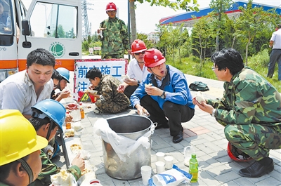 总经理李志泰 ( 右二 ) 与职工一同在工地吃午餐