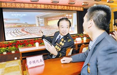 当听到胡锦涛总书记报告中“支持工会、共青团、妇联等人民团体充分发挥桥梁纽带作用,更好反映群众呼声,维护群众合法权益”、“完善党的代表大会制度,提高工人、农民代表比例”、“提高发展党员质量,重视从青年工人、农民、知识分子中发展党员,优化党员队伍结构”等有关工人、工会的内容时,全国劳模、北京地铁司机张晓雨与一位一起收看十八大实况的劳模会心一笑。