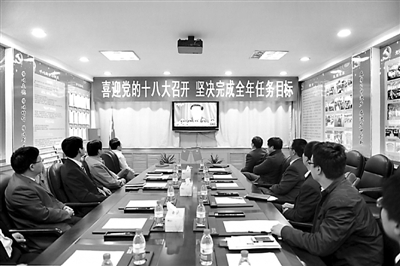 11月8日,中国共产党第十八次全国代表大会隆重开幕,冀中能源股份公司邢东矿党员干部职工通过电视、网络、广播,认真收听收看开幕盛况,共同见证这一历史时刻。图为该矿党委学习中心组在收看十八大开幕盛况。王印河 杨涛 摄