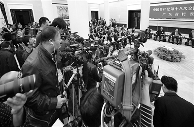 11月9日,十八大代表继续分组讨论十八大工作报告。这是记者们采访广东团的一个镜头。