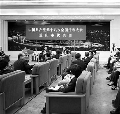 11月8日下午,十八大重庆代表团向中外记者开放。图为讨论结束后,重庆代表团接受中外记者提问时的情景。