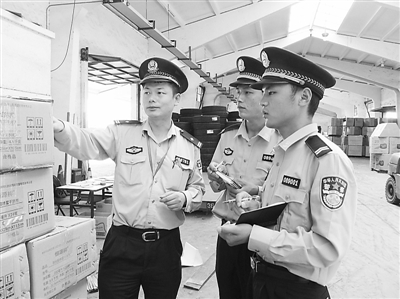 图为民警在上海北郊站库台上对待运物品进行安全检查和登记。