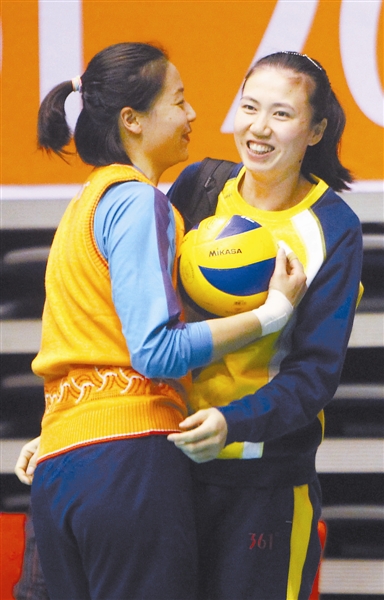 11月8日,天津女排、浙江女排在浙江嘉善同场训练。周苏红、魏秋月一见面,相互热情招呼。CFP供图