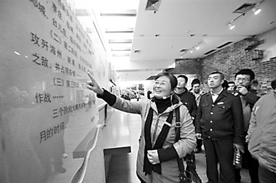 日前,在西柏坡纪念馆,职工陈国英(中)在为游客讲解。石家庄市公交四公司工会精心选拔50余名了解“红色知识”的党员职工,组成“义务讲解员服务队”,来到西柏坡为游客义务讲解革命历史。康静 摄