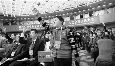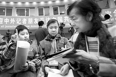 11月11日《中国少年报》11岁小记者张佳鹏和孙露源正在十八大新闻中心接受年龄最大的“花甲记者”屈月英的采访。两位小记者面对自己角色被转换为采访对象,伸出指头回答道,我们先谈一个问题,其余的等新闻发布会结束后再谈……