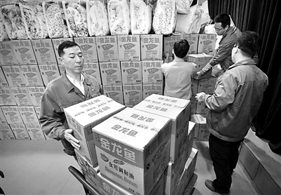 11月13日,工作人员在搬运为困难残疾人准备的食用油。当日,2012年“送温暖、献真情、共建和谐新天津”大型公益助残活动在天津启动。从2012年末至2013年初,天津市区、县政府残工委以及残疾人福利基金会将投入超过2600万元资金,用于购置冬季衣被、米面、食用油以及幼儿轮椅等物资,为全市10万余困难残疾人送去浓浓的暖意。