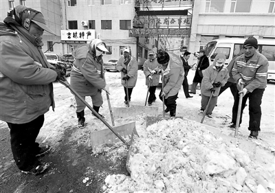 11月13日,几位环卫工人合力将雪推到路边。11月12日,吉林大部分地区出现暴雪天气。为清除已下了30余个小时的暴雪且不影响交通,长春全市1.2万余名环卫工人凌晨2点就开始工作,坚守在清雪一线,为百姓筑起一道橙色的安全线。新华社记者 张楠 摄