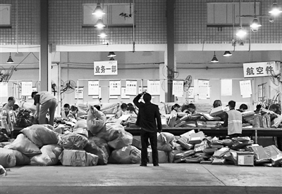 “双十一”大规模的促销活动,促使快递业务急剧膨胀。11月11日,杭州滨江区申通快递繁忙的发货现场。 CFP供图