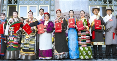行使了选举权之后的几位少数民族代表特意拿着投票夹在人民大会堂门前合影留念。