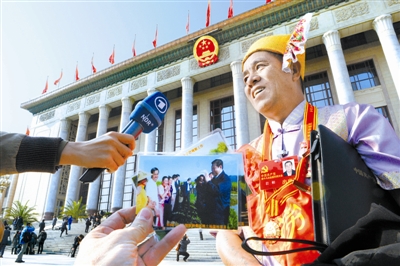 在人民大会堂门前身披劳模彩带的岩帕代表,拿着习近平同志视察他家乡时的照片给大家传看。他说,我对新产生的一届中央委员会非常满意。