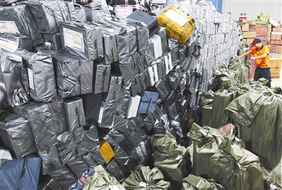 11月13日,浙江省温州市。淘宝“双十一”网购狂欢节火得一塌糊涂,“疯狂”过后,包裹快递如潮水般涌向快递行业。订购过后,大家都在期待送货上门的快递员早点按响门铃,但当看到快递公司的仓库堆积如山、让人头皮发麻的包裹时,才意识到快递员们都快忙死了。