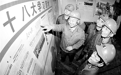 11月12日,在安徽淮北矿业涡北矿机修厂电焊车间,一块不足2平方米的十八大学习园地,吸引了近百名职工来浏览学习。党的十八大召开以来,为方便大家随时了解会议精神和进程,老党员纵曙光(左二)找来彩色即时贴纸和《人民日报》等资料,自己动手,在车间一角开辟了一块“十八大学习园地”,并且自当义务讲解员。他还从图书馆和电子阅览室收集、整理了一些党代会的相关知识讲给工友听,吸引着车间职工流连忘返。陈彪 摄