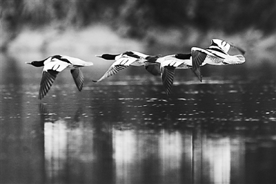 初冬,江西鄱阳湖水系修河陆续飞来30余只越冬的国家一级保护动物中华秋沙鸭。连续多年,成群的中华秋沙鸭都会来此越冬。