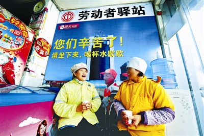 11月15日,河南洛阳,环卫工人师傅在洛阳市涧西区周天百货劳动者驿站进行短暂休息。劳动者驿站主要负责接待环卫、园林绿化等户外流动作业的劳动者,为他们提供饮水、遮风避雨、降温取暖、短暂休息等服务。张怡熙 摄
