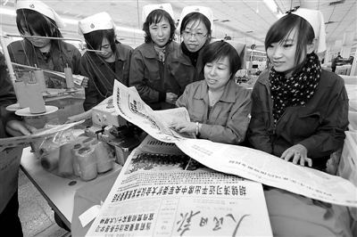 11月18日,山东省即墨市一家企业的缝纫女工在学习十八大会议精神。大家纷纷表示,用十八大精神统一思想、凝聚力量、指导工作,努力创造更加幸福美好的明天。梁孝鹏 摄