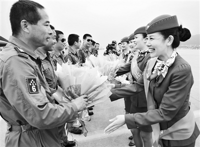 18日下午,刚刚结束一周的飞行表演、走下飞机的中国空军“八一”飞行表演队,在歼10机队旁接受了来自河北航空集团的慰问,“冀鹰示范乘务组”空乘人员向队员献花,表达了河北航空对“八一”飞行表演队由衷的敬意。