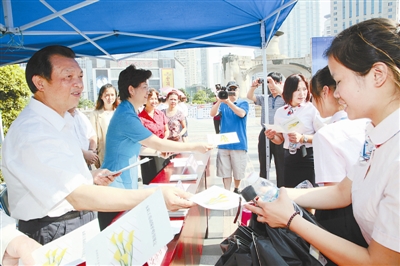 自治区政协副主席、自治区总工会主席李达球(左一),自治区总工会副主席、女职工委员会主任陈湘文(左二)为女职工发放《女职工劳动保护特别规定》宣传册