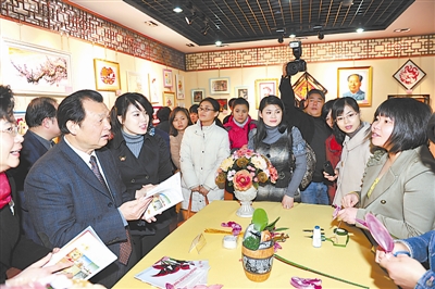 自治区政协副主席、自治区总工会主席李达球与女职工手工制作能人亲切交谈