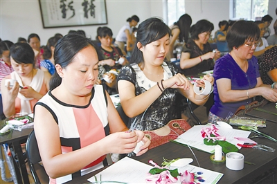 正在广西工会“巧手女工”创业培训基地学习丝网花制作的女职工