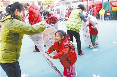 11月21日,北京市东四五条幼儿园的小朋友和家长一起参加“回收旧报纸”亲子游戏竞赛。当日,该园大班小朋友及家长300余人在园内参加了一场“创意环保亲子运动会”。运动会以环保为主题,旨在通过创意游戏,让孩子们从小树立环保意识。