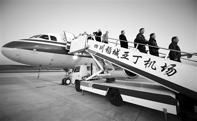 11月23日,在四川稻城亚丁机场,体验试飞的乘客走下飞机。