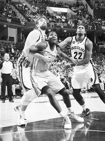 北京时间11月20日的NBA常规赛中,灰熊队的小加索尔(左)与盖伊(右),篮下夹防掘金队员。