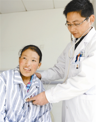 11月24日,医师沙纪名在给先天性心脏病患儿次仁央宗(左)做出院前最后一次检查。
