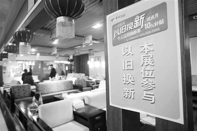 图为11月17日,在北京集美家居定慧寺店拍摄的北京家具“以旧换新”提示栏。