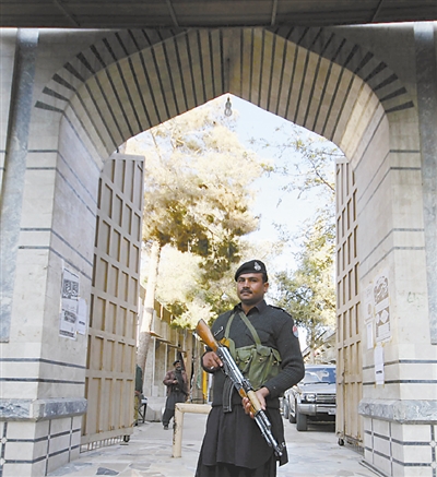 11月25日,在巴基斯坦西南部城市奎达,一名士兵在一清真寺前警戒。