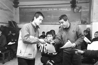 11月25日,冀中能源张矿集团怀矿公司党委宣传科利用中午区队交接班时间,在交接班室、机修车间举行十八大知识宣传暨有奖问答活动。工作人员将学习材料发放给职工阅读后,还现场进行了有奖知识抢答。图为工作人员发放奖品。杨静 摄