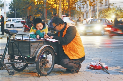 11月13日,郑州,17时40分,顺河路,7岁的王兆祥子在爷爷的陪伴下趴在三轮车上写作业。