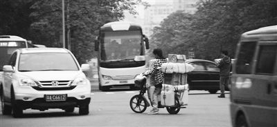 在没有交警执勤的其它路口,记者观察了不到10分钟,就有大约20多名市民无视不远处的红绿灯,直接在车流中穿过,甚至有位推着小推车的中年人,车上堆着满满一车货物。