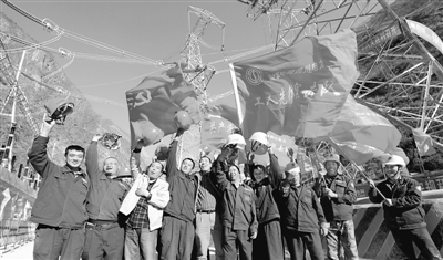 图为在四川省凉山州冕宁县磨房沟镇锦屏二级电站N1塔前,施工人员正在欢庆线路贯通。 本报记者 许之丰 摄