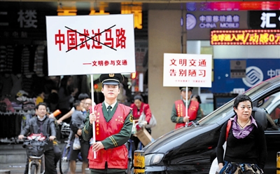 12月1日,广东边防七支队官兵在深圳市繁华路段的十字路口举着标语,倡导市民文明过马路。