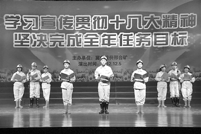 连日来,河北省冀中能源股份公司邢台矿利用多种形式宣传十八大精神,把十八大精神与本矿工作实际紧密结合,落到实处。十八大后,该矿工会组织各单位文艺骨干编排矿工喜闻乐见的文艺节目,宣传十八大精神。12月5日,全矿16个区队文艺骨干同台表演,800名矿工在娱乐中受到教育。