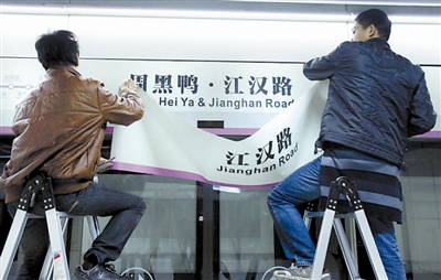 12月4日晚11时20分,武汉地铁2号线江汉路站,工人将最后一张“周黑鸭·江汉路”站点标识替换成“江汉路”站。至此,所有二号线广告冠名地铁站点标识全部替换完毕。去年底,周黑鸭等9家企业取得武汉地铁2号线站点的冠名权。前段时间这些站名被指“过度商业化”,引发热议。上月底,站点冠名全部被取消。 王筝 摄