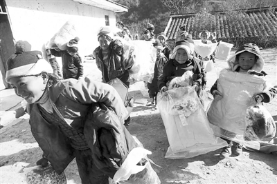 12月3日,四川凉山彝族自治州美姑县洪溪片区毛洪觉村级小学的学生搬运获赠的过冬物品回家。