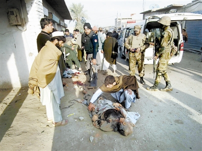 12月10日,巴基斯坦士兵和居民在西北部本努特区的自杀式袭击现场围观。