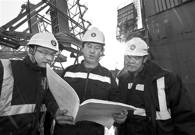 12月11日,十八大代表孔祥瑞(中)和工友在工作现场学习十八大报告。