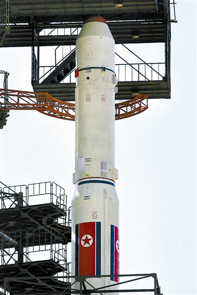 这是2012年4月8日在朝鲜平安北道铁山郡东昌里的“西海卫星发射场”拍摄的“银河3号”运载火箭。 新华社记者 张利 摄