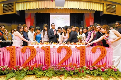 2012年12月12日是本世纪最后一个年月日重叠的结婚“旺日”,更被华人赋予“要爱要爱要爱”的吉祥诠释,成为情侣青睐的完婚日子。新华社发(张纹综 摄)