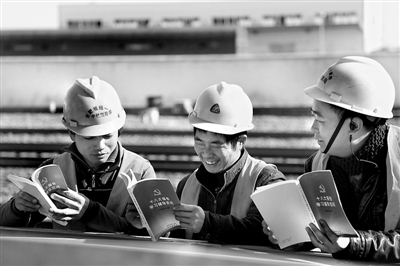 12月6日,合肥枢纽南环线施工现场,农民工正兴致勃勃地看着十八大报告学习辅导资料。合(肥)宁(南京)客运专线长安集站改工程,是我国首次对客运专线中间站进行站场扩能技术改造,工期紧,任务重,技术难度大。参加施工的农民工早出晚归,无法及时了解党的十八大会议精神。为了解决这一问题,建设单位专门购买了《十八大报告辅导读本》、《十八大报告学习辅导百问》等学习资料,第一时间发到农民工手中。