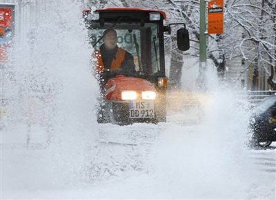 12月6日,环卫工人在德国柏林街头除雪。当日,德国首都柏林降下今年入冬以来最大的一场雪。 新华社记者 马宁 摄