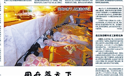 上图:12月6日,本报刊发《郑州大桥下,仍睡着农民工》的报道。