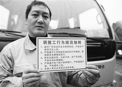 12月14日,调整工邓中银展示“行为规范号牌”。湖北襄阳东风轻型商用车公司(筹)制作“调整工行为规范细则”发放到每一名调整工,并针对近期气候寒冷且雨、雾较多,以及冬季可能出现的降雪,要求调整工作业时严格遵守有关安全规定。(李国震 陈守军)